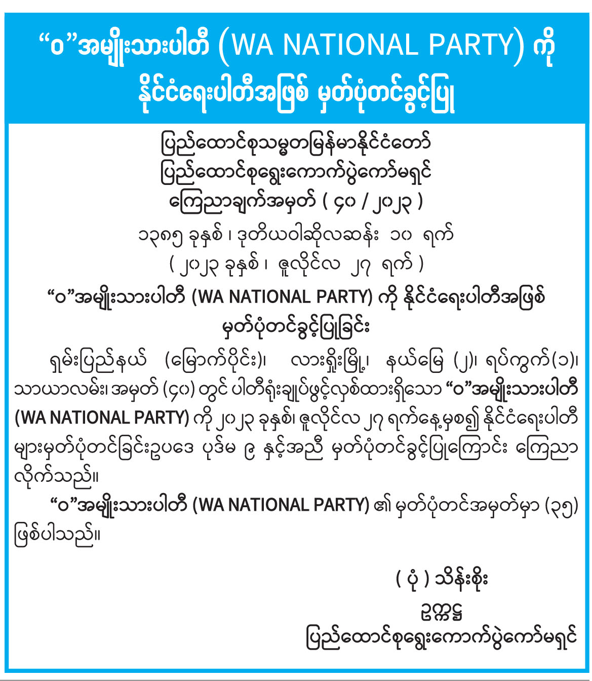 "ဝ" အမျိုးသားပါတီ (WA NATIONAL PARTY) ကို နိုင်ငံရေးပါတီအဖြစ် မှတ်ပုံတင်ခွင့်ပြု