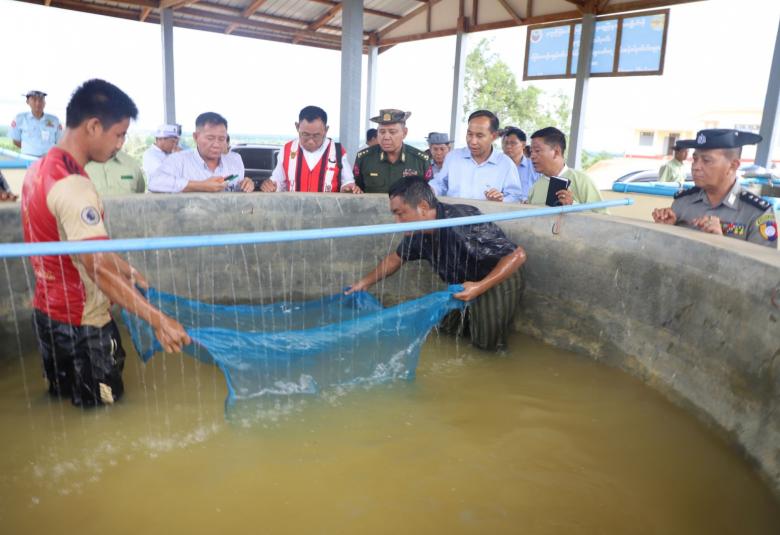 ထို့နောက် တိုင်းဒေသကြီး ဝန်ကြီးချုပ်က မြစ်ချောင်းများအတွင်းနှစ်စဉ် ငါးမျိုးစိတ်များ စိုက်ထည့်ခြင်းနှင့် ငါးမွေးမြူရေးလုပ်ငန်း ဆောင်ရွက်သူများ၏ လိုအပ်ချက်များ ပြည့်မီအောင် ထုတ်လုပ်ပေးခြင်းဖြင့် ဒေသခံပြည်သူများအတွက် ငါးစားသုံးမှုဖူလုံအောင် ဆောင်ရွက်ပေးနိုင်မည်ဖြစ်၍ လျာထားချက်ပြည့်မီအောင် ငါးသားပေါက်ထုတ်လုပ်ရန် မှာကြားခဲ့ပြီး ရှင်းလင်းတင်ပြချက်များအပေါ် လိုအပ်သည်များ ကိုတာဝန်ရှိသူများနှင့် ဖြည့်ဆည်းပေါင်းစပ် ဆောင်ရွက်ပေးကာ ငါးသားပေါက်များထုတ်လုပ်နေမှု၊ ငါးကန်များတူးဖော်ပြီးစီးမှုနှင့် ရုံး၊ ဝန်ထမ်းအိမ်ရာ အဆောက်အဦများ တည်ဆောက်ပြီးစီးမှုတို့အား လိုက်လံကြည့်ရှုစစ်ဆေးခဲ့ကြသည်။