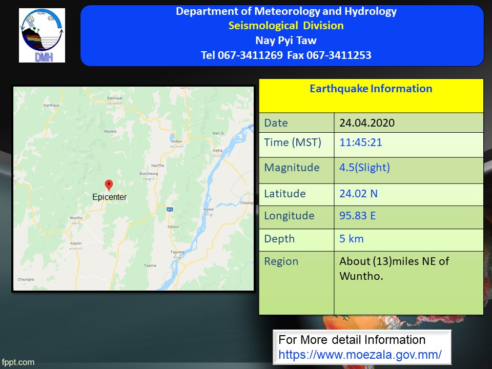 ၂၀၂၀ ပြည့်နှစ်၊ ဧပြီလ (၂၄) ရက်နေ့၊ မြန်မာစံတော်ချိန် (၁၁) နာရီ၊ (၄၅) မိနစ်၊ (၂၁) စက္ကန့် အချိန်တွင် ကသာမြေငလျင်စခန်းမှ အနောက်တောင်ဘက် (၃၄)မိုင် ခန့်ကွာ ဝေးသော မြန်မာနိုင်ငံ ပြည်တွင်း (ဝန်းသိုမြို့၏ အရှေ့မြောက်ဘက် (၁၃)မိုင်ခန့် အကွာ)၊ မြောက်လတ္တီတွဒ် (၂၄.၀၂) ဒီဂရီ၊ အရှေ့လောင်ဂျီတွဒ် (၉၅.၈၃)ဒီဂရီ၊ အနက်(၅)ကီလိုမီတာကို ဗဟိုပြု၍ အင်အား ရစ်(ခ်)တာစကေး (၄.၅) အဆင့်ရှိ အင်အားအနည်းငယ်ရှိသော မြေငလျင်တစ်ခု လှုပ်ရှား သွားကြောင်း မိုးဇလမှ ထုတ်ပြန်ထားသည်။
