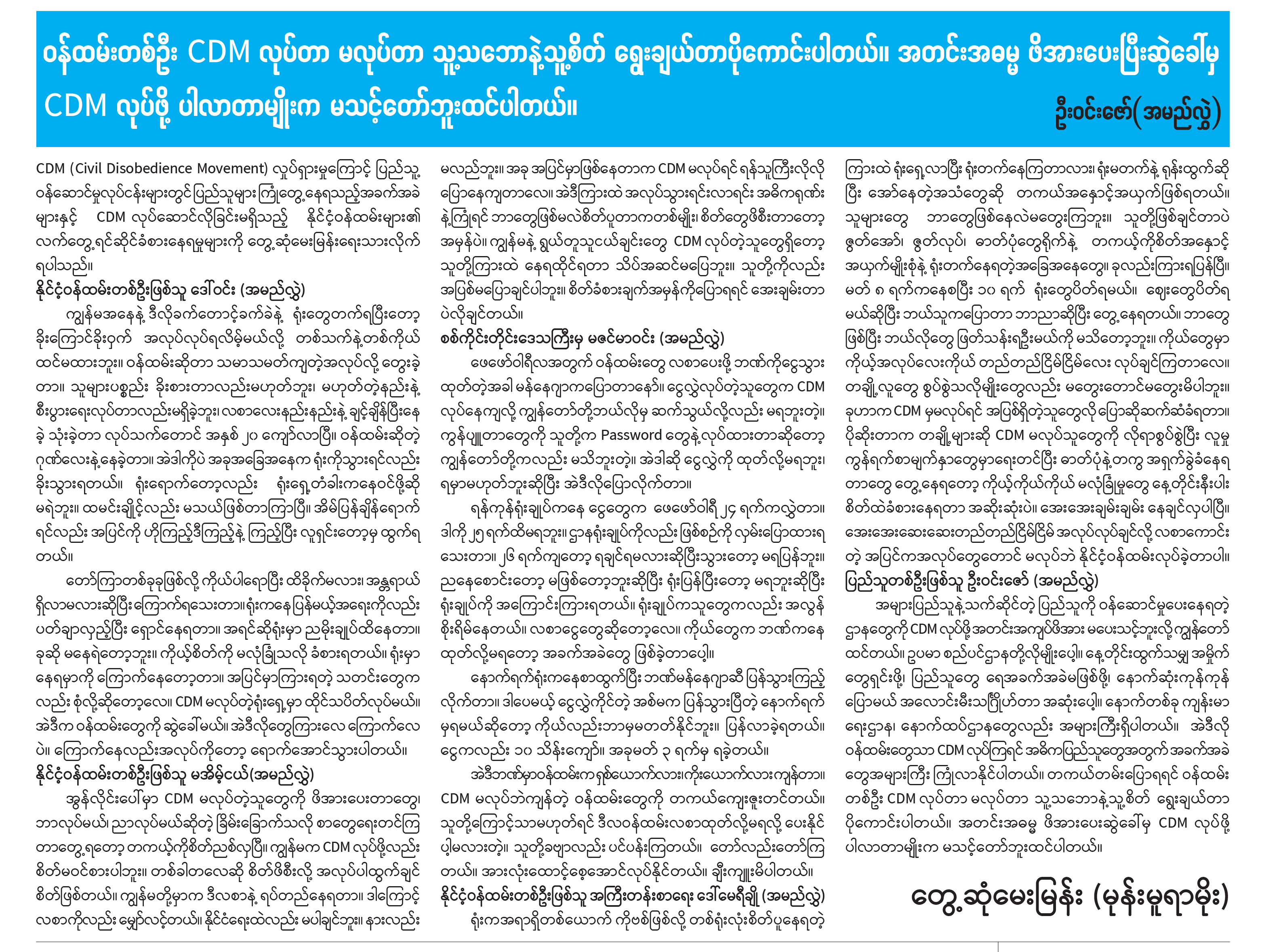 ဝန်ထမ်းတစ်ဦး CDM လုပ်တာ မလုပ်တာ သူ့သဘောနဲ့သူ့စိတ် ရွေးချယ်တာပိုကောင်းပါတယ်။ အတင်းအဓမ္မ ဖိအားပေးပြီးဆွဲခေါ်မှ CDM လုပ်ဖို့ ပါလာတာမျိုးက မသင့်တော်ဘူးထင်ပါတယ်။