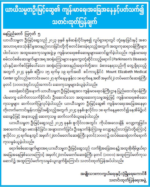 ယာယီသမ္မတဦးမြင့်ဆွေ၏ ကျန်းမာရေးအခြေအနေနှင့်ပတ်သက်၍ သတင်းထုတ်ပြန်ချက်