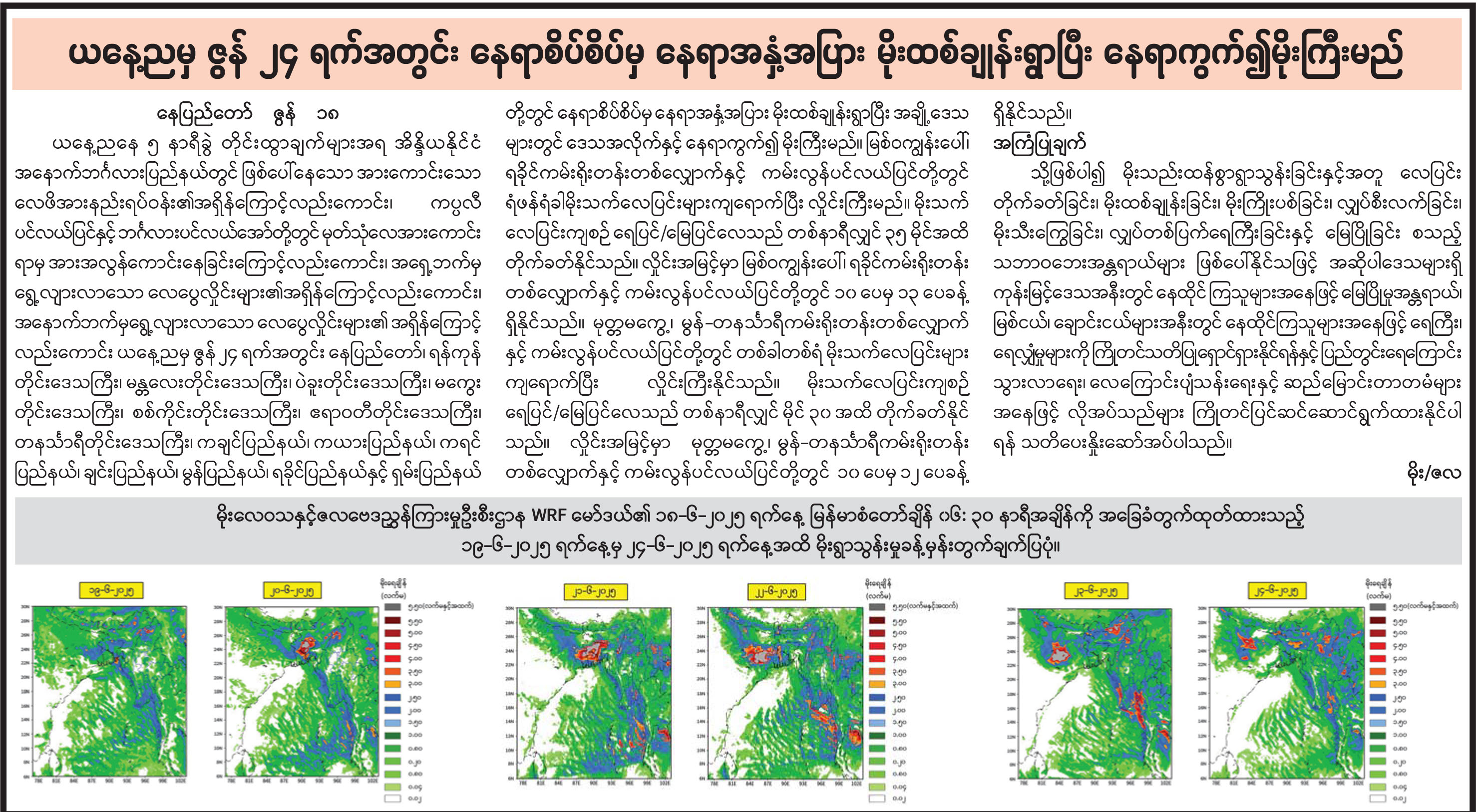 ယနေ့ညမှ ဇွန် ၂၄ ရက်အတွင်း နေရာစိပ်စိပ်မှ နေရာအနှံ့အပြား မိုးထစ်ချုန်းရွာပြီး နေရာကွက်၍ မိုးကြီးမည်