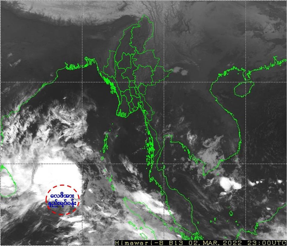 ဘင်္ဂလားပင်လယ်အော်အ‌ခြေအနေမှာ ယနေ့မြန်မာစံတော်ချိန် နံနက် ၅ နာရီခွဲ တိုင်းထွာချက်များအရ ဘင်္ဂလား ပင်လယ်အော်တောင်ပိုင်းနှင့် ယင်းနှင့်ဆက်စပ်လျက်ရှိသော အီကွေတာအနီး အိန္ဒိယ သမုဒ္ဒရာတို့တွင် ဖြစ်ပေါ်နေသော လေဖိအားနည်းရပ်ဝန်းသည် ဆက်လက်တည်ရှိနေသည်။ အဆိုပါ လေဖိအားနည်းရပ်ဝန်းသည် နောက်(၁၂)နာရီအတွင်း မုန်တိုင်းငယ်(Depression)အဖြစ်သို့ အားကောင်းလာနိုင်ပြီး အနောက်-အနောက် မြောက်ဘက်သို့ ဆက်လက်ရွေ့လျားကာ  သီရိလင်္ကာနိုင်ငံ ကမ်းရိုးတန်းသို့ ဦးတည်ရွေ့လျားနိုင်သည်ဟု ခန့်မှန်းရသည်။ ဘင်္ဂလားပင်လယ်အော်တောင်ပိုင်းတွင် တိမ်ထူထပ်နေပြီး ကပ္ပလီပင်လယ်ပြင်နှင့် ကျန်ဘင်္ဂလားပင်လယ်အော်တို့တွင် တိမ်အနည်းငယ်မှ တိမ်အသင့်အတင့် ဖြစ်ထွန်းနေသည်။
