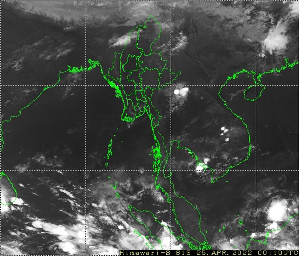 ယနေ့ညနေအထိခန့်မှန်းချက်မှာ  စစ်ကိုင်းတိုင်းဒေသကြီးအထက်ပိုင်းနှင့် ကချင်ပြည်နယ်တို့တွင် နေရာကျဲကျဲနှင့် ဧရာဝတီတိုင်းဒေသကြီးနှင့် တနင်္သာရီတိုင်းဒေသကြီးတို့တွင် နေရာကွက်ကျား မိုးထစ်ချုန်းရွာမည်။ ရွာရန်ရာနှုန်း(၈၀)ဖြစ်သည်။ ကျန်တိုင်းဒေသကြီးနှင့် ပြည်နယ်တို့တွင် တိမ်အသင့်အတင့် ဖြစ်ထွန်းမည်။