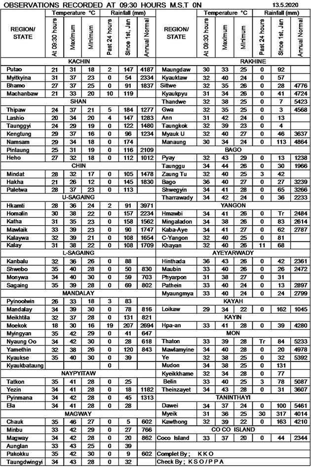 အောက်မှာဖော်ပြထားတာကတော့ ယမန်နေ့ညနေက တိုင်းထွာရရှိခဲ့သော တိုင်းဒေသကြီးနှင့် ပြည်နယ်များ၏ အမြင့်ဆုံးအပူချိန်၊ ယနေ့တိုင်းထွာရရှိခဲ့သော အနိမ့်ဆုံးအပူချိန်နှင့် မိုးရေချိန်တို့ပဲ ဖြစ်ပါတယ်။