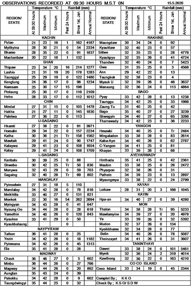 အောက်မှာဖော်ပြထားတာကတော့ ယမန်နေ့ညနေက တိုင်းထွာရရှိခဲ့သော တိုင်းဒေသကြီးနှင့် ပြည်နယ်များ၏ အမြင့်ဆုံးအပူချိန်၊ ယနေ့တိုင်းထွာရရှိခဲ့သော အနိမ့်ဆုံးအပူချိန်နှင့် မိုးရေချိန်တို့ပဲ ဖြစ်ပါတယ်။
