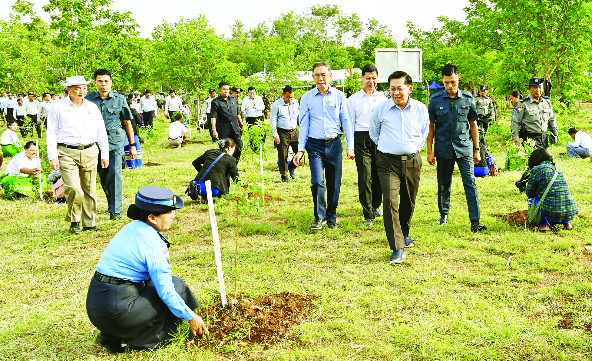 ဆက်လက်၍ နိုင်ငံတော်စီမံအုပ်ချုပ်ရေးကောင်စီ ဥက္ကဋ္ဌ နိုင်ငံတော်ဝန်ကြီးချုပ်သည် ၂၀၂၅ ခုနှစ် မိုးရာသီလူထုလှုပ်ရှားမှုအသွင်ဖြင့် ပြုလုပ်သည့် သစ်ပင်စိုက်ပျိုးပွဲတော်သို့ တက်ရောက်လာကြသူများက ပျိုးပင်များအား တပျော်တပါး စိုက်ပျိုးနေမှုကို လှည့်လည်ကြည့်ရှုအားပေးသည်။