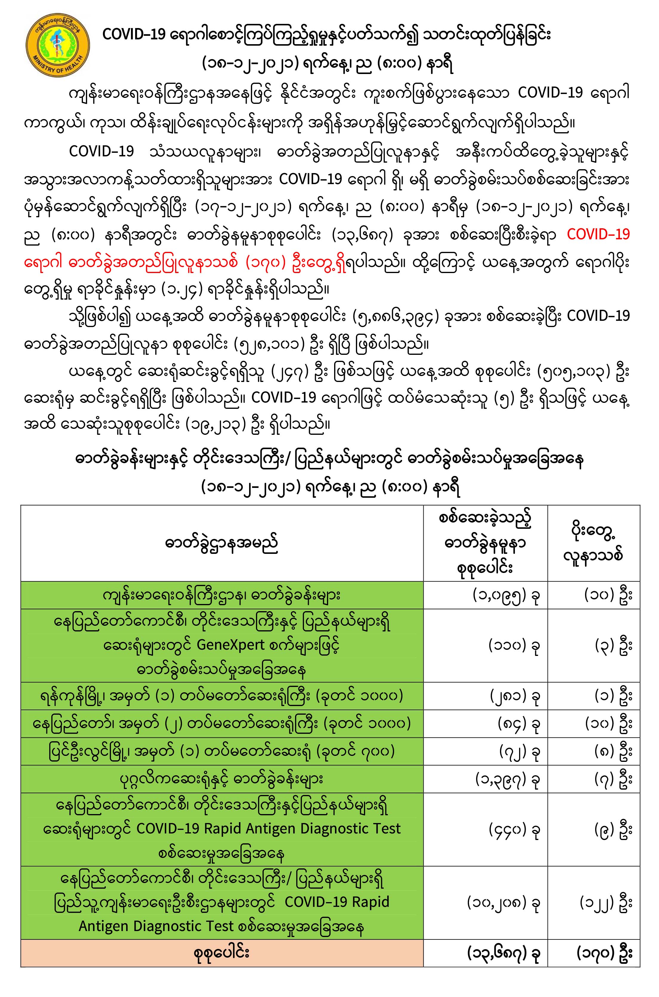 ယနေ့တွင် COVID-19 ရောဂါ ဓာတ်ခွဲအတည်ပြုလူနာသစ် (၁၇၀) ဉီး တွေ့ရှိပြီး (၅)ဉီးထပ်မံသေဆုံး