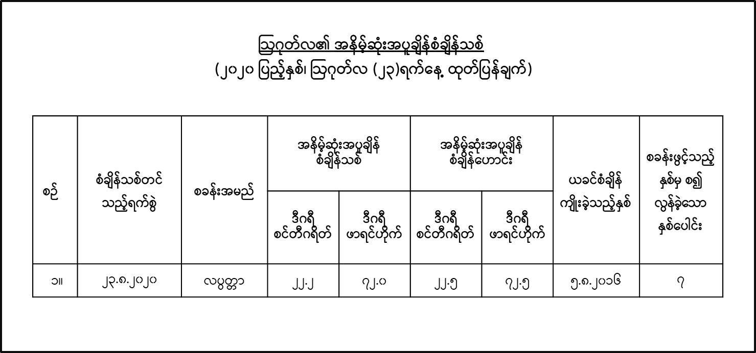 ယနေ့တွင် မိုးလေဝသနှင့် ဇလဗေဒညွှန်ကြားမှုဦးစီးဌာနမှ ထုတ်ပြန်သည့် ဩဂုတ်လ၏ အနိမ့်ဆုံးအပူချိန်စံချိန်သစ်
