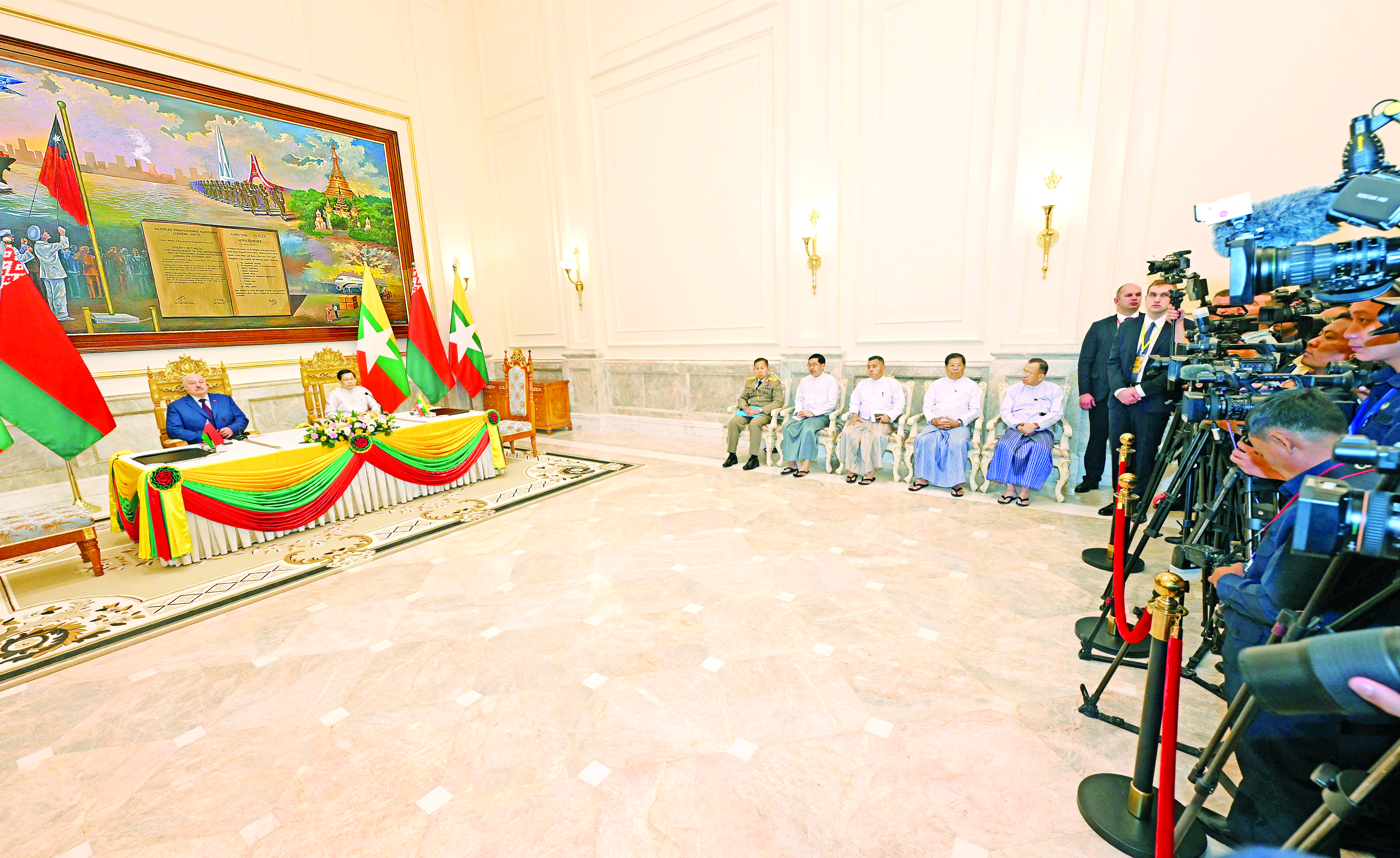နိုင်ငံတော်ယာယီသမ္မတ နိုင်ငံတော်လုံခြုံရေးနှင့် အေးချမ်းသာယာရေးကော်မရှင်ဥက္ကဋ္ဌ၏ ယခုနှစ်မတ်လအတွင်း ဘယ်လာရုစ်သမ္မတနိုင်ငံသို့သွားရောက်ခဲ့သည့် နိုင်ငံတော်အဆင့် တရားဝင်ချစ်ကြည်ရေးခရီးစဉ်အတွင်း နှစ်နိုင်ငံအကြား ပူးပေါင်းဆောင်ရွက်ရေးဆိုင်ရာ နားလည်မှုစာချွန် လွှာများကို လက်မှတ်ရေးထိုးနိုင်ခဲ့သည်။ ယခု ဘယ်လာရုစ်သမ္မတနိုင်ငံ သမ္မတကြီး၏ မြန်မာနိုင်ငံသို့ ပထမဆုံးလာရောက်သည့် တရားဝင်ချစ်ကြည် ရေးခရီးစဉ်အတွင်း နှစ်နိုင်ငံ ပူးပေါင်းဆောင်ရွက်မှု မြှင့်တင်ရေးဆိုင်ရာ လမ်းပြမြေပုံ(၂၀၂၆-၂၀၂၈)၊ နှစ်နိုင်ငံအကြား ပြည်ဝင်ဗီဇာ ကင်းလွတ်ခွင့်ပေးရေးဆိုင်ရာ သဘောတူစာချုပ်အပါအဝင် နှစ်နိုင်ငံအကြား ပူးပေါင်းဆောင်ရွက်ရေးဆိုင်ရာ နားလည်မှု စာချွန်လွှာများဖြစ်သည့် သိပ္ပံနှင့်နည်းပညာဆိုင်ရာ ပူးပေါင်းဆောင်ရွက်မှုနားလည်မှုစာချွန်လွှာများ၊ အကောက်အခွန်ဆိုင်ရာ ကိစ္စရပ်များတွင် ပူးပေါင်းဆောင်ရွက်ရေးဆိုင်ရာ နားလည်မှုစာချွန်လွှာများ၊ ပို့ကုန်ချေးငွေမူဘောင် သဘောတူညီချက်နှင့် နိုင်ငံတော်အဆင့် စံချိန်စံညွှန်းသတ်မှတ်ခြင်း၊ အရည်အသွေးကိုက်ညီမှုစစ်ဆေးခြင်း၊ တိကျစွာ တိုင်းတာခြင်းနှင့် အသိအမှတ်ပြုခြင်းနယ်ပယ်တို့တွင် ပူးပေါင်းဆောင်ရွက်ရေးဆိုင်ရာ နားလည်မှုစာချွန်လွှာများ၊ နှစ်နိုင်ငံပူးပေါင်းဆောင်ရွက်မှု မြှင့်တင်ရေးဆိုင်ရာ လမ်းပြမြေပုံ၊ ကုန်သွယ်ရေး၊ စီးပွားရေး၊ သိပ္ပံ၊နည်းပညာနှင့် ယဉ်ကျေးမှုဆိုင်ရာ ပူးပေါင်းဆောင်ရွက်မှုစာချွန်လွှာများ၊ တရားမဝင်နှင့် ကူးသန်းရောင်းဝယ်ရေးဆိုင်ရာ ကိစ္စရပ်များတွင် ဥပဒေရေးရာ အပြန်အလှန်အကူအညီပေးရေး သဘောတူစာချုပ်နှင့် ရင်းနှီးမြှုပ်နှံမှုမြှင့်တင်ရေးဆိုင်ရာ နည်းလည်မှုစာချွန်လွှာများကို နှစ်ဖက် လက်မှတ်များ ရေးထိုးကာ အပြန်အလှန် လဲလှယ်ခဲ့ကြခြင်းဖြစ်သည်။