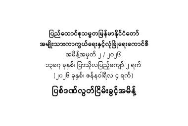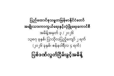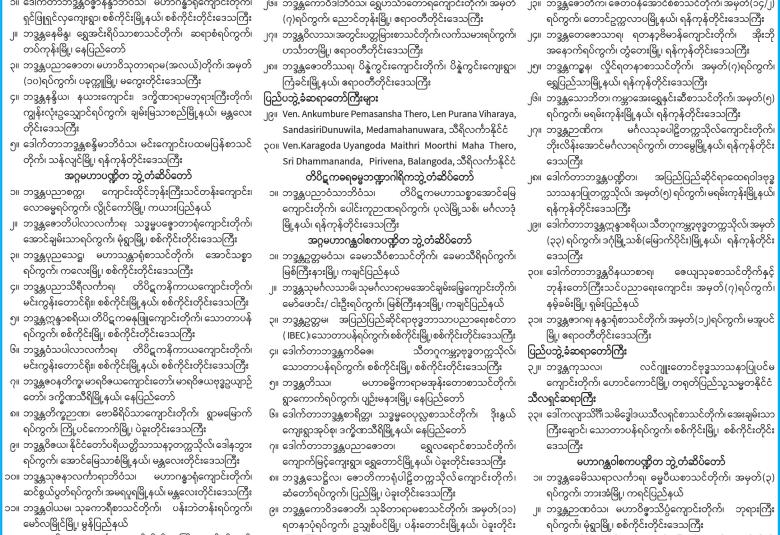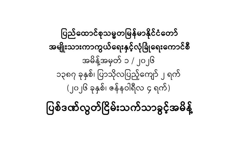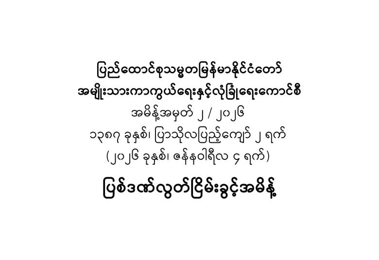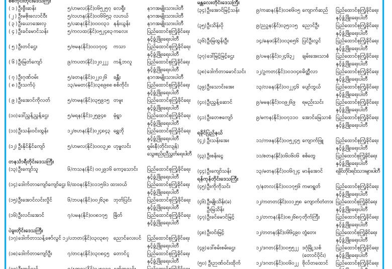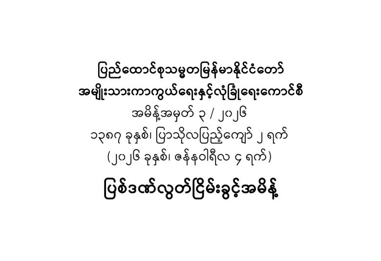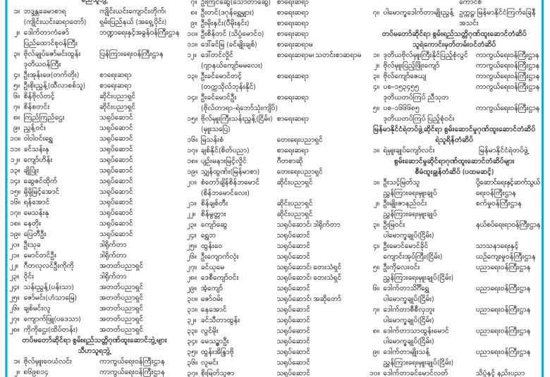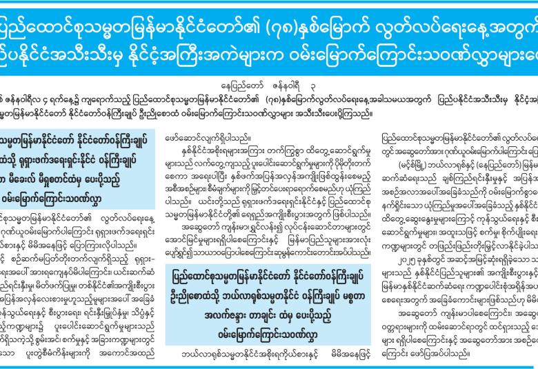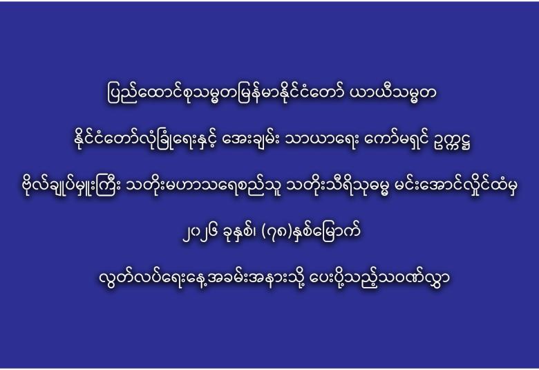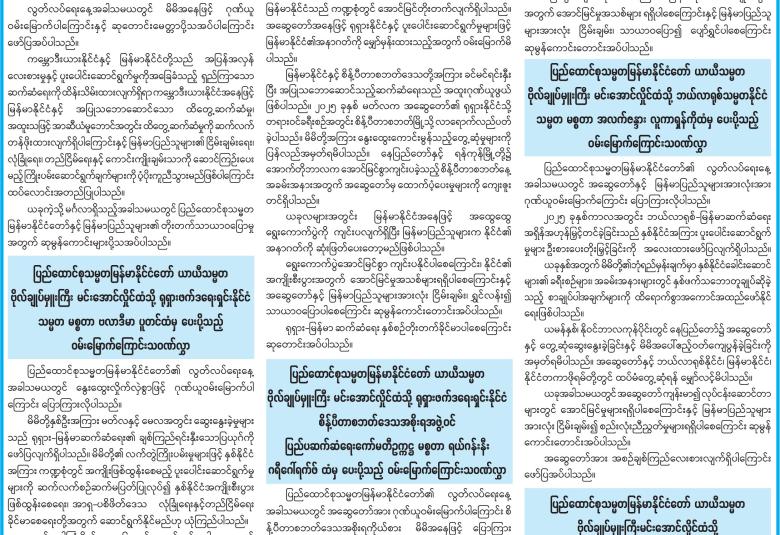 Home Jan 4,2026 |09:55 | ပြည်တွင်း ပြစ်ဒဏ်လွတ်ငြိမ်းခွင့်အမိန့် Jan 4,2026 |09:54 | ပြည်တွင်း ပြစ်ဒဏ်လွတ်ငြိမ်းခွင့်အမိန့် Jan 4,2026 |09:52 | ပြည်တွင်း ပြစ်ဒဏ်လွတ်ငြိမ်းသက်သာခွင့်အမိန့် Jan 4,2026 |08:50 | နိုင်ငံရေး ပြည်သူ့လွှတ်တော်ကိုယ်စားလှယ်အဖြစ် ရွေးကောက်တင်မြှောက်ခံရသူများ အမည်စာရင်းကြေညာ Jan 4,2026 |08:46 | နိုင်ငံရေး ၂၀၂၅ ခုနှစ် ပါတီစုံဒီမိုကရေစီအထွေထွေရွေးကောက်ပွဲအပိုင်း(၁) ပြည်သူ့လွှတ်တော် ကိုယ်စားလှယ်လောင်း တစ်ဦးချင်း ဆန္ဒမဲရရှိမှုအခြေအနေ Jan 4,2026 |08:33 | ပြည်တွင်း (၇၈)နှစ်မြောက်လွတ်လပ်ရေးနေ့အခါသမယအတွက် ပြည်ပနိုင်ငံအသီးသီးမှ နိုင်ငံ့အကြီးအကဲများက ပြည်ထောင်စုသမ္မတမြန်မာနိုင်ငံတော် နိုင်ငံတော်ဝန်ကြီးချုပ် ဦးညိုစောထံ ဝမ်းမြောက်ကြောင်းသဝဏ်လွှာများ အသီးသီးပေးပို့ Jan 4,2026 |08:22 | ပြည်တွင်း (၇၈)နှစ်မြောက်လွတ်လပ်ရေးနေ့အခါသမယအတွက် ပြည်ပနိုင်ငံအသီးသီးမှ နိုင်ငံ့အကြီးအကဲများက ပြည်ထောင်စုသမ္မတမြန်မာနိုင်ငံတော် ယာယီသမ္မတ ဗိုလ်ချုပ်မှူးကြီးမင်းအောင်လှိုင်ထံ ဝမ်းမြောက်ကြောင်းသဝဏ်လွှာများ အသီးသီးပေးပို့ Jan 4,2026 |08:06 | မိန့်ခွန်းများ ပြည်ထောင်စုသမ္မတမြန်မာနိုင်ငံတော် ယာယီသမ္မတ နိုင်ငံတော်လုံခြုံရေးနှင့် အေးချမ်း သာယာရေး ကော်မရှင် ဥက္ကဋ္ဌ ဗိုလ်ချုပ်မှူးကြီး သတိုးမဟာသရေစည်သူ သတိုးသီရိသုဓမ္မ မင်းအောင်လှိုင် ထံမှ ၂၀၂၆ ခုနှစ်၊ (၇၈)နှ စ်မြောက် လွတ်လပ်ရေးနေ့အခမ်းအနားသို့ ပေးပို့သည့်သဝဏ်လွှာ Jan 4,2026 |07:34 | ပြည်တွင်း ဂုဏ်ထူးဆောင်ဘွဲ့များ၊ ဂုဏ်ထူးဆောင်တံဆိပ်များ ချီးမြှင့်အပ်နှင်း Jan 4,2026 |06:48 | ပြည်တွင်း သာသနာတော်ဆိုင်ရာ ဘွဲ့တံဆိပ်တော်များ ဆက်ကပ်လှူဒါန်း Jan 2,2026 |01:28 | ပြည်တွင်း ရှမ်းပြည်နယ်(တောင်ပိုင်း)၌ စိုက်ပျိုးရေးနှင့်မွေးမြူရေးလုပ်ငန်းများ ဖွံ့ဖြိုးတိုးတက်ရေးအတွက် လိုအပ်ချက်များ စီမံဆောင်ရွက်ပေးရန် ကွင်းဆင်းဆောင်ရွက် Jan 2,2026 |01:23 | ပြည်တွင်း စက်မှုဝန်ကြီးဌာန ဝန်ထမ်းများနှင့် မိသားစုများ၏ နှစ်သစ်ကူးပျော်ပွဲရွှင်ပွဲ အခမ်းအနား ကျင်းပ Jan 2,2026 |11:28 | အားကစား ကင်မရွန်းက မိုဇမ်ဘစ်ကို အနိုင်ယူပြီး အာဖရိကနိုင်ငံများဖလားပြိုင်ပွဲ ၁၆ သင်းအဆင့်တက်လှမ်း Jan 2,2026 |11:23 | စီးပွားရေး ဒလမြို့နယ်၌ မျိုးစေ့ချကိရိယာဖြင့် နွေစပါး လက်တွေ့စိုက်ပျိုး Jan 2,2026 |11:20 | ယဉ်ကျေးမှုနှင့် ခရီးသွား ကလောမြို့ မောမြေဦးပန်းခြံ၌ ပထမအကြိမ် ပန်းပွဲတော်ကျင်းပ ၂၀၂၅ ခုနှစ် ပါတီစုံဒီမိုကရေစီ အထွေထွေရွေးကောက်ပွဲ ကျင်းပရန် 00 Days 00 Hours 00 Minutes 00 Seconds နောက်ဆုံးရသတင်းများ အချုပ်အခြာအာဏာကိုထိန်းသိမ်း ဒီမိုကရေစီပန်းတိုင်သို့တက်လှမ်း (ကြေးမုံ) Jan 04 ပြစ်ဒဏ်လွတ်ငြိမ်းခွင့်အမိန့် Jan 04 ပြစ်ဒဏ်လွတ်ငြိမ်းခွင့်အမိန့် Jan 04 ပြစ်ဒဏ်လွတ်ငြိမ်းသက်သာခွင့်အမိန့် Jan 04 ပြည်သူ့လွှတ်တော်ကိုယ်စားလှယ